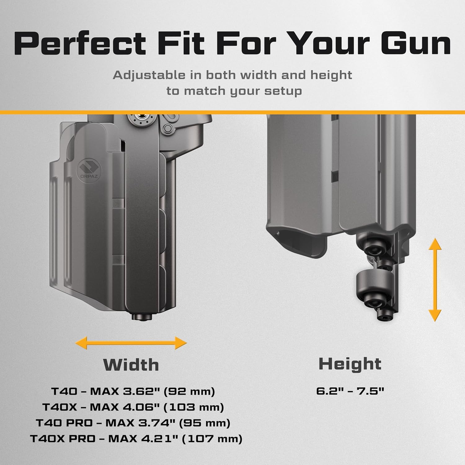 Highlights: Universal Fit for Pistol & Light: Width and height adjustable to accommodate most pistols and tactical lights—T40 fits medium lights (TLR-7, Baldr Mini, XC1, etc.) Check compatibility chart before...
