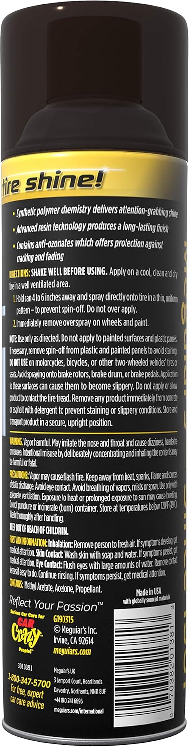 Highlights: HIGHEST GLOSS TIRE SHINE: synthetic polymer chemistry delivers our highest gloss tire shine LASTING FINISH: advanced resin technology produces a long-lasting finish PROTECTION: anti-ozonants offer protection against cracking and...