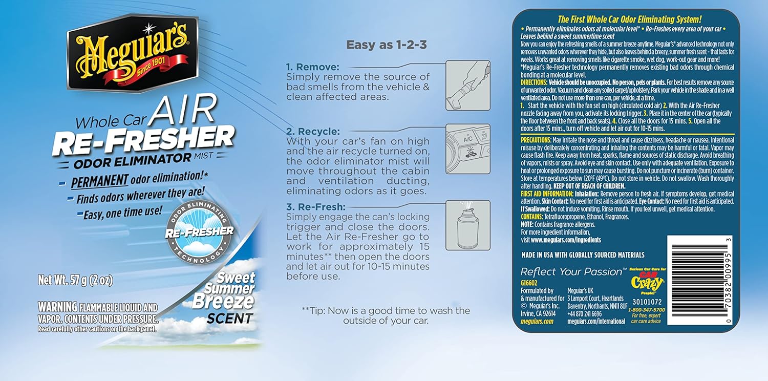 Highlights: FRESHEN UP YOUR CAR: One 2 oz spray bottle of Meguiar's Whole Car Air Refresher removes tough odors and replaces them with a pleasant new car scent SPRAY AND...