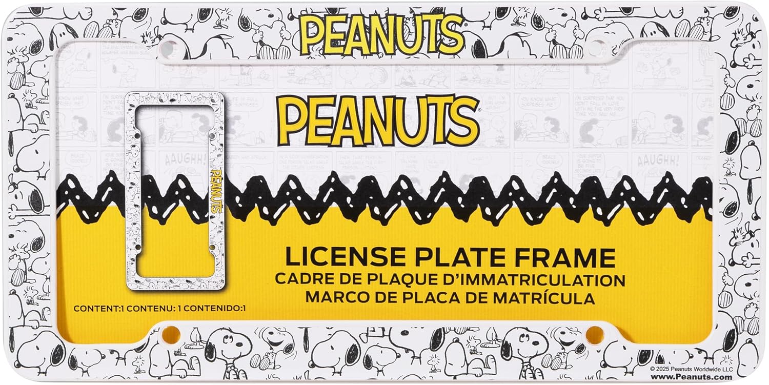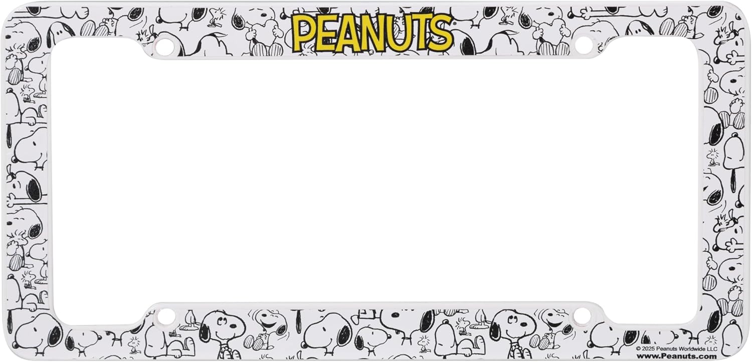 Highlights: Peanuts Official Licensed Product. Designed and manufactured by CHROMA This sturdy Plastic Frame fits standard Automobile, Commercial, and Trailer license plates of 12 inches x 6 inches 4 pre-drilled...