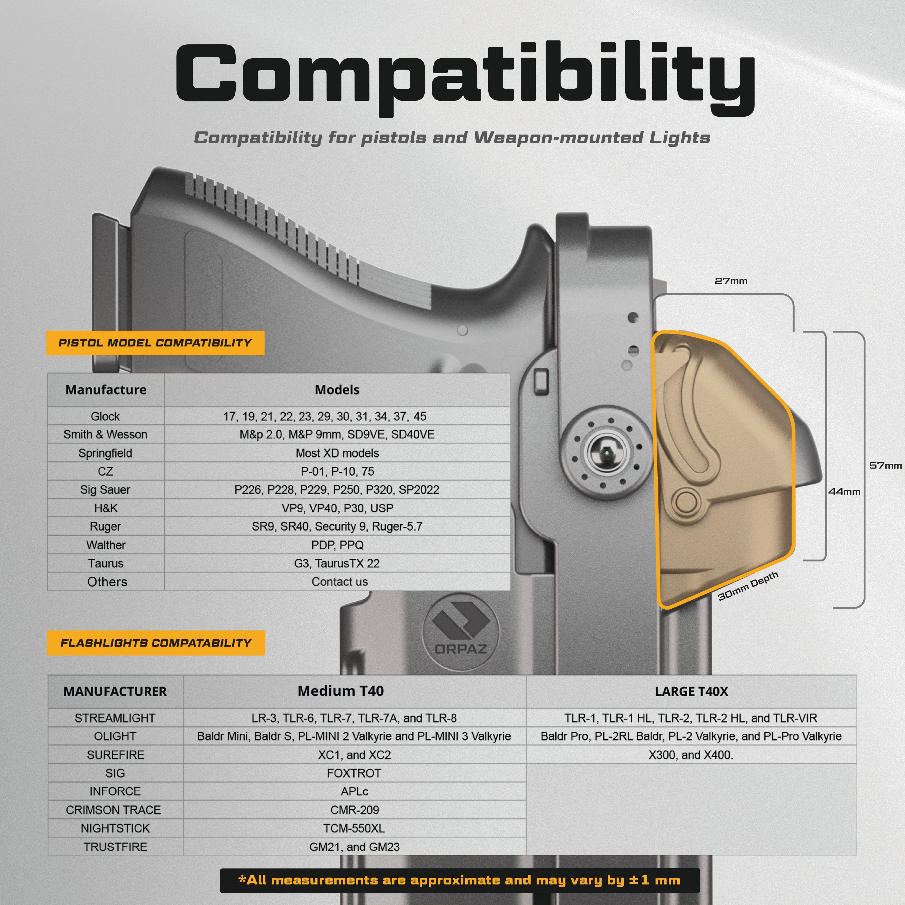 Highlights: Universal Fit for Pistol & Light: Width and height adjustable to accommodate most pistols and tactical lights—T40X fits large lights (TLR-1, X300, PL-Pro, etc.) Check compatibility chart before purchase....