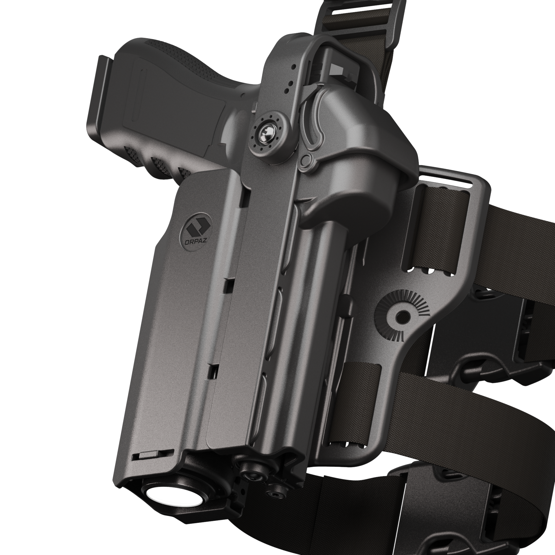 The Orpaz T40 LEFT-HANDED Light-Bearing Holster Family provides exceptional versatility and security for tactical operators and law enforcement professionals. Fully adjustable in both width and height, these holsters securely accommodate a wide range of pistols and tactical flashlights. Featuring a unique adjustable magnetic retention mechanism at the holster base, it securely fits pistol barrel lengths between 6.2" to 7.5".