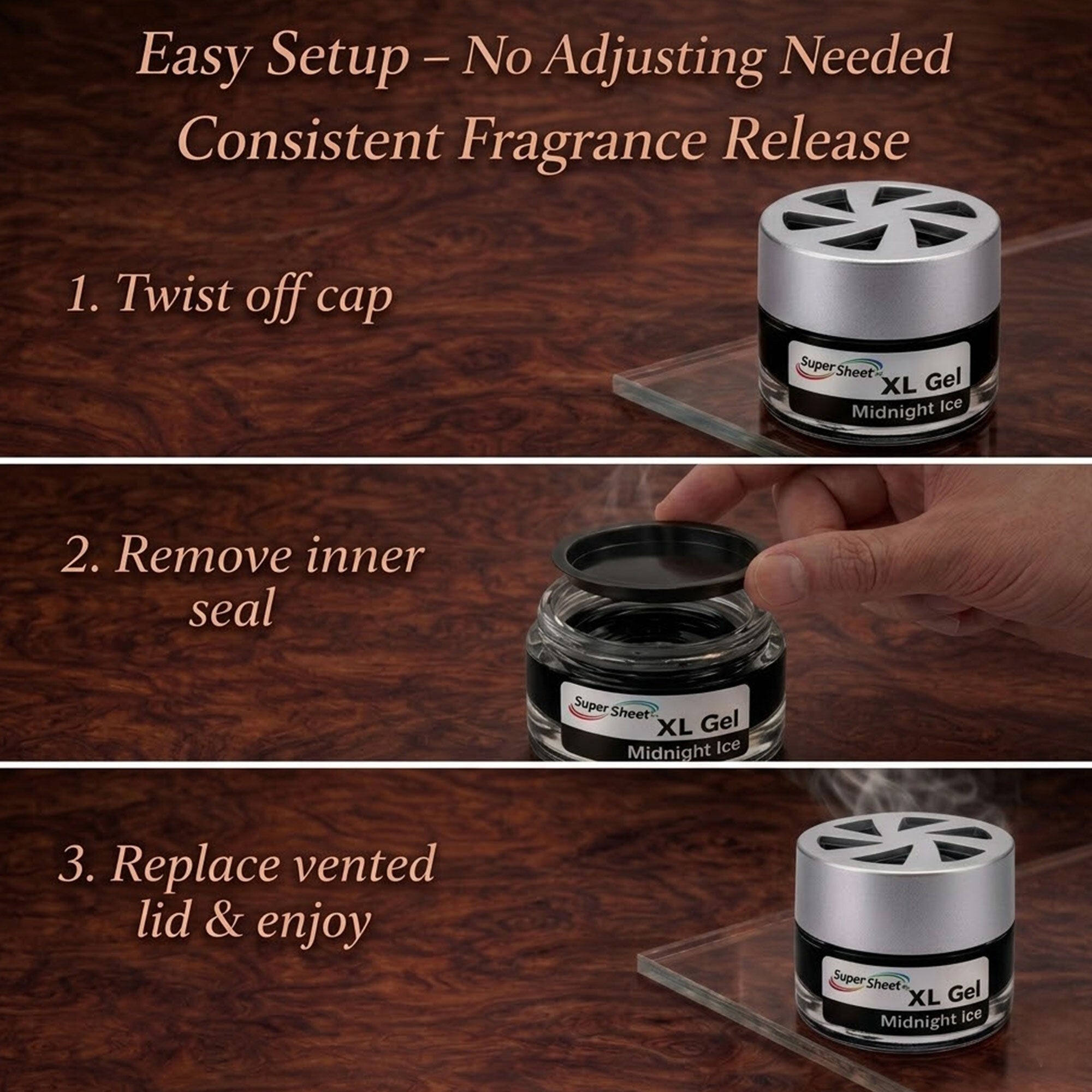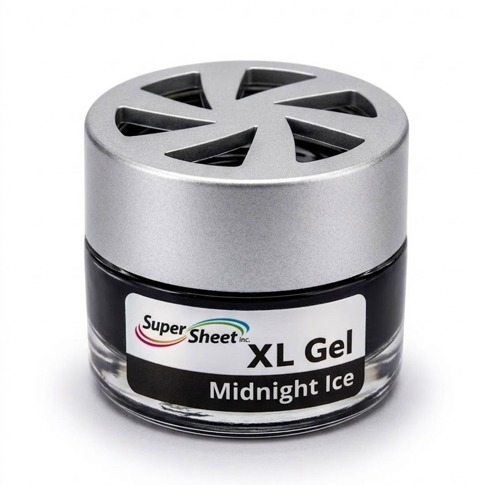Upgrade your space with the Super Sheet XL Gel Air Freshener, designed in a premium heavy glass jar with a modern silver vented lid. Unlike typical cardboard or tin fresheners, this luxury gel diffuser delivers a smooth, consistent fragrance for up to 60 days. The balanced formula refreshes your car without being overpowering, making it ideal for daily driving, rideshare vehicles, or small spaces like offices and bathrooms. Simply remove the inner seal, replace the vented lid, and enjoy steady scent release. Made in the USA with domestic and foreign components and sealed for freshness.