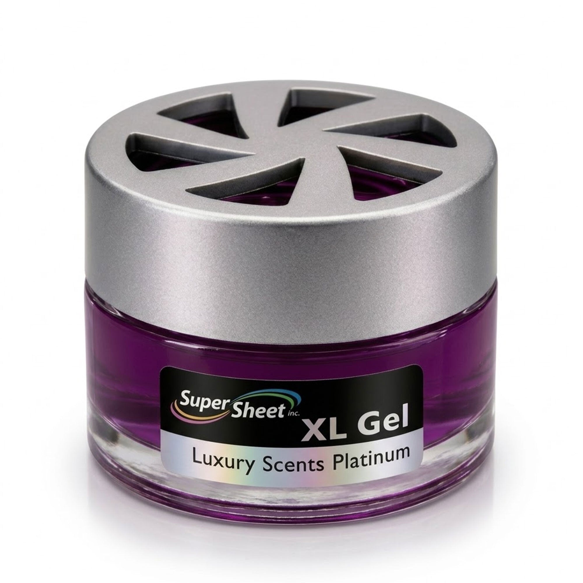 Upgrade your space with the Super Sheet XL Gel Air Freshener, designed in a premium heavy glass jar with a modern silver vented lid. Unlike typical cardboard or tin fresheners, this luxury gel diffuser delivers a smooth, consistent fragrance for up to 60 days. The balanced formula refreshes your car without being overpowering, making it ideal for daily driving, rideshare vehicles, or small spaces like offices and bathrooms. Simply remove the inner seal, replace the vented lid, and enjoy steady scent release. Made in the USA with domestic and foreign components and sealed for freshness.